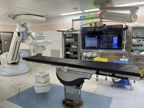 ハイブリッド手術室とは、元来別の場所に設置されていた外科的治療を行う手術室と、カテーテル等を扱う内科的治療を行う血管撮影室を組み合わせた手術室のことです。異なる手技である外科的手技とカテーテルを用いた内科的手技を一つの部屋で行えるようにすることで高度で安全な医療、最新の医療技術を用いた治療が可能となります。