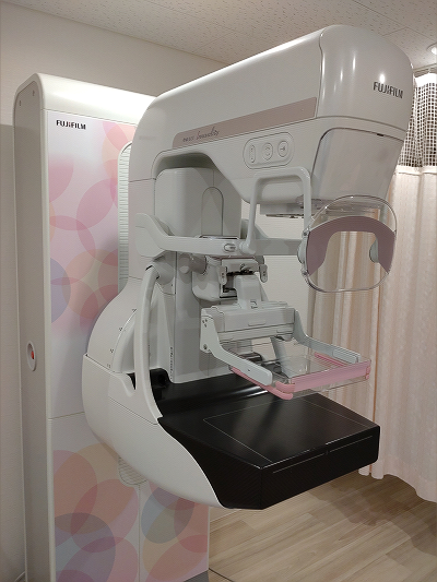 マンモグラフィは、乳房専用のX線検査で、乳がんやその他の乳房の病変を早期に発見するための画像診断法です。乳房を上下または斜め方向から圧迫して、薄く広げた状態でX線を照射し撮影します。圧迫することで乳腺の重なりを減らし、病変を見つけやすくします。また、少ないX線量で鮮明な画像が得られます。撮影時間は数分程度で、左右の乳房をそれぞれ撮影します。