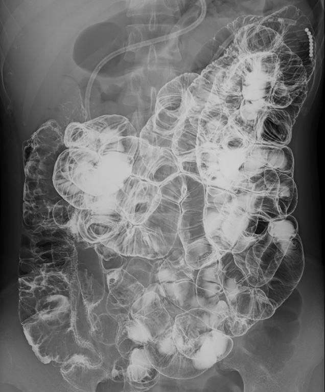 嚥下造影検査は、食べ物や飲み物を飲み込むときの動きを、X線透視装置を使ってリアルタイムに観察する検査です。バリウムを混ぜた飲み物や食べ物を実際に口から摂取していただき、その様子をテレビモニターで撮影しながら評価します。飲み込みの機能に問題がある場合その原因や程度を詳しく調べることができます。胃のバリウム検査は、造影剤と発泡剤(胃をふくらませる薬)を服用し、食道・胃・十二指腸の形や動き、粘膜の異常などをX線で詳しく調べる検査です。小腸造影検査は、造影剤を使って小腸の形や動き、異常の有無をX線で観察する検査です。小腸は、胃と大腸の間にある消化管で、全長約6〜7メートルもあり、通常のX線写真では観察が難しい部位です。